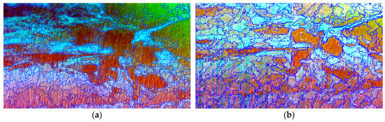 Objects after the segmentation for rocky and sandy areas of the seafloor: (a) AHS; (b) WV-2.