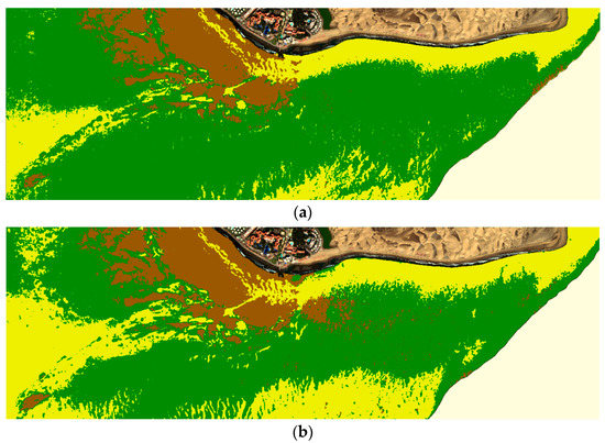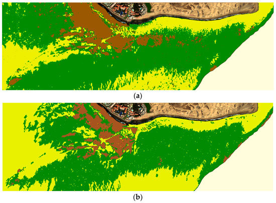 AHS pixel-based classification (majority 5 × 5): (a) ML using bands 1 to 8; (b) SVM using the bands plus the texture of the first principal component.