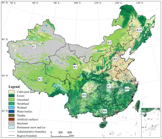 Cultivated land, forest, wetland, water bodies, and permanent snow and ice register user’s accuracies greater than 82%, as shown in Table 5. Grassland and bareland have higher user’s accuracy in regions where these classes are dominant (R1–R3 and R5), while their user’s accuracies are much decreased in the other six regions because of class rarity. Shrubland and artificial surfaces, which account for small area proportions of China (1.0% and 1.8%, respectively), have medium-level user’s accuracies (Table 5).