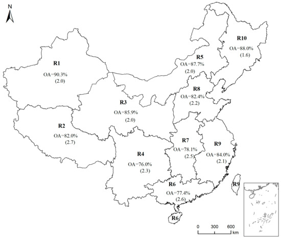 To evaluate nationwide accuracies, regional error matrices need to be aggregated to a national error matrix at first. This is done by summing up corresponding cell values at (i, j) (i.e., area proportions for map-reference class pair (i, j)) in regional error matrices via proper weights that are individual regions’ areal proportions in the entire study area. Consider the study here as an example. The ten regional error matrices were estimated using Equations (1)–(4), as listed in Appendix B. The weights ( in Equation (6)) were the ten regions’ areal proportion relative to the whole study area (Table 2, the last row, Row “Country-wide proportion”). In terms of a formula, the aggregated proportion for a particular class pair (i, j) () is computed as a weighted sum of corresponding proportions in regional error matrices: