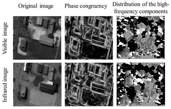 The distribution of the high-frequency components of log-Gabor filters has been verified to be robust to non-linear intensity variations [29,31], and phase congruency has been successfully used for multispectral image template matching [34,35,36,37]. This makes us think that a descriptor combining phase congruency and the distribution of the high-frequency components would be more efficient to capture the common information of multi-sensor images, which is the idea behind the proposed approach. Figure 1 shows a comparison between phase congruency and the distribution of the high-frequency components for a pair of visible and infrared remote sensing images. Vertically, the phase congruency and the distribution of the high-frequency components are similar for the visible and infrared images, even with the non-linear intensity changes existing between the visible and infrared images. Horizontally, the phase congruency is more like the enhanced edges of an image, and the distribution of the high-frequency components is more like the coarse texture of the image.