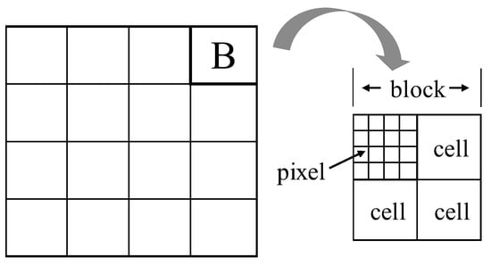 - The second step is to apply Gaussian filters to the six-oriented PCMs to obtain the convolved PCMs and mean filters to the six-oriented MBMs to obtain the convolved MBMs, based on the same template size. The template size is equal to the patch size of a cell, and four cells combine to form a block. The relationship between blocks and cells is shown in Figure 5.