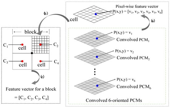 Figure 6. The process of constructing the feature vector for a block. (a) Compute the pixel-wise feature vector using the convolved PCMs. P(x, y) means the feature vector of the pixel in location P(x, y), and the vector size is 1 × 6; (b) obtain the central pixel’s feature vector of each cell. C1, C2, C3, and C4 are the corresponding centric pixel’s feature vectors of the four cells; (c) Combine the four feature vectors to obtain the conjoint feature vector for a block. The feature vector size of the block is 1 × 24. - To calculate the feature vector of the block based on the convolved six-oriented MBMs. The convoluted values of the six-oriented MBMs in each pixel contribute to the orientation bins of the pixel. The process of constructing the feature vector for a block based on the MBMs is similar to the process of constructing the feature vector for the block based on the PCMs. The convolved six-oriented MBMs are used to replace the convolved six-oriented PCMs (Figure 6), and the remaining operation is the same. The dimension of the feature vector is also 24 bins. We also normalize the feature vector by the L2 norm. The character Y is used to represent the normalized feature vector based on the MBMs.