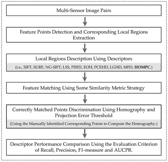 The main contribution of this paper is that we proposed a new descriptor to solve the local region feature description problem of multi-sensor images with non-linear radiation variations. In this section, the experimental setup is presented to test our proposed HOMPC descriptor. Figure 7 shows the flowchart to evaluate the descriptor performance in our experiments. In order to evaluate the performance of descriptors, some pair of multi-sensor images are chosen and the feature points are detected firstly. Then, the local regions corresponding to the feature points are described using descriptors, and the feature matching is completed with some similarity metric. Then, the correctly matched points and falsely matched points are classified by using the homography and projection error. The homography is calculated by using the manually identified corresponding points of the pair of multi-sensor images. Since two important indicators for evaluating descriptor performance are “repeatability” and “distinctiveness” [19], we finally selected precision and recall to verify the “distinctiveness” and “repeatability” of descriptors, respectively. The F1-measure and area under precision-recall curves (AUCPR) are used to verify the comprehensive performance of precision and recall. A more detailed introduction of the feature detection method is presented in Section 3.1. The details of the feature descriptors are supplied in Section 3.2, and the evaluation criteria and datasets are provided in Section 3.3 and 3.4, respectively. The parameter settings in our experiments are listed in Section 3.5.