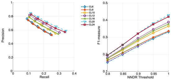 The ability of a descriptor can be evaluated by “repeatability” and “distinctiveness” [19]. The common evaluation criteria, including recall and precision from [45], F1-measure, and AUCPR from [17], and projection error from [43,46] were chosen to measure the descriptor performance.
