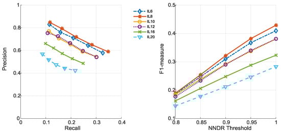 The proposed HOMPC method contains four main parameters, namely, NS, NO, CL, and IL. As mentioned NS = 4 and NO = 6 are used to express the number of convolution scales and orientations of the log-Gabor filter in the proposed method. Parameter CL is the size of the local cell patch (cell size) used for the cell description. If the cell size is too small, it will contain insufficient information with which it is difficult to reflect the distinctiveness of the feature. In contrast, if the cell size is too large, it is easily affected by the local geometric distortion. Parameter IL is the number of intervals between blocks. In general, the smaller the number of intervals, the richer the information of the constructed HOM and HPC, and the poorer the robustness and the higher the dimension of the feature vectors. In contrast, if the number of intervals is too large, the HOMPC descriptor will contain less information, which will also affect the distinctiveness of the feature. Therefore, suitable parameters are very important. In this section, we describe the parameter study and sensitivity analysis based on the 44RGB/LWIR dataset. We designed two independent experiments to learn parameters CL and IL, where each experiment had only one parameter as a variable, with the other parameters as fixed values. The experimental setup details are summarized in Table 1. For each parameter, we use the average precision and recall, F1-measure, and AUCPR as the evaluation metric. The experimental results are reported in Figure 9 and Figure 10; Table 2 and Table 3.