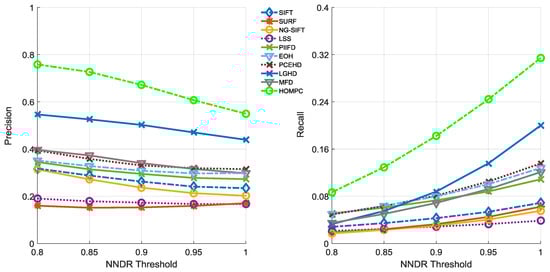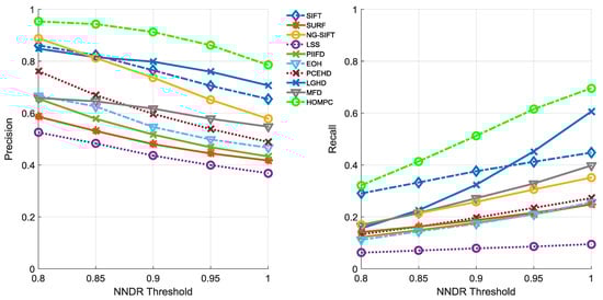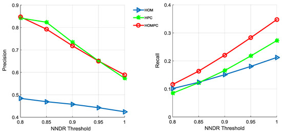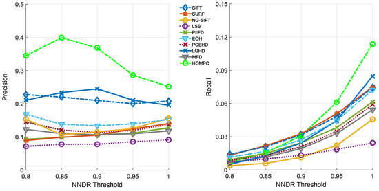 The patch size of the proposed HOMPC descriptor was assigned to 80 × 80, the same as EOH, LGHD, and MFD. The patch sizes of other descriptors were set by default. We use NS = 4 and NO = 6 to express the number of convolution scales and orientations of the log-Gabor filter in the proposed method. The projection error threshold was assigned to 5 for all three datasets. The larger the projection error threshold, the more correctly matched points for the recall and precision calculations. The threshold of NNDR was assigned to the range 0.8–1.0 with an interval of 0.05 in our experiments, where a smaller value means a tighter matching criterion.