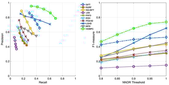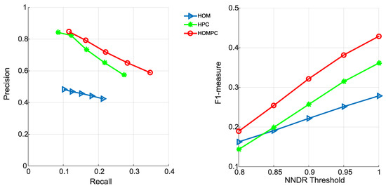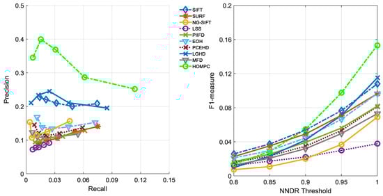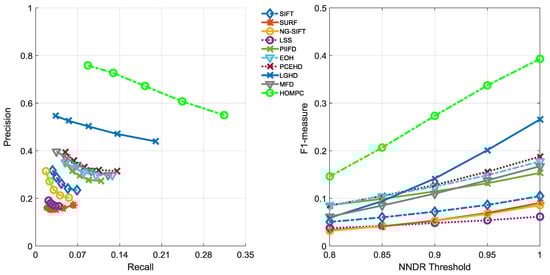To better express the universality of the proposed HOMPC descriptor and the other descriptors, the average precision and recall were calculated from the multi-sensor image pairs of each dataset according to different NNDR thresholds. The F1-measure and AUCPR were calculated from the average precision and recall values.