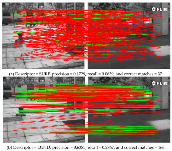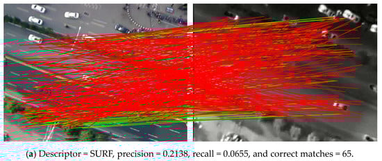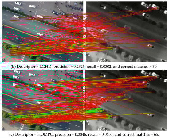 Figure 16 and Figure 17, Table 6 show the average precision and recall results, as well as F1-measure and AUCPR results obtained with the 27 pairs of RGB/thermal infrared images. As can be seen in Figure 16, the precision curves of HOMPC are again the best, but the average precision values and recall values are much lower than the average precision and recall results, as well as the F1-measure and AUCPR results for the CVC dataset, especially for the recall values. The AUCPR results of all the descriptors also indicate that the biggest value of HOMPC is just 14.95, which is much lower than most of the results for the CVC dataset. This is because the CVC dataset has been vertically rectified. In contrast, when using the low-resolution thermal infrared camera, the thermal infrared images in the UAV dataset have a lower resolution and there is noise generated in the images. Furthermore, the UAV dataset also has a slight projective transformation caused by the UAV platform. However, we can still clearly see that the proposed HOMPC descriptor is more robust than the other descriptors. Nevertheless, the AUCPR values are very low (below 15%), even if the precision of HOMPC is good when the recall is low. This means that the distances between the feature vectors for local feature regions for true or false matchings are very close but are discriminant enough when there is a need to retrieve only one region. Therefore, the threshold should be large enough to obtain more matching points. Figure 18 shows the correctly matched points (green lines) and false matches (red lines) of two typical descriptors (SURF and LGHD) and the proposed HOMPC descriptor for a pair of images (Figure 8d) when the NNDR threshold = 1. The results of precision and recall, as well as correct matches are also given in Figure 18a–c. It is shown that all three descriptors performed poor, but our proposed HOMPC descriptor also performed best.
