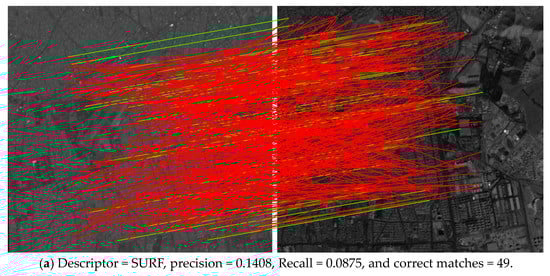 Even though these descriptors perform slightly better than the traditional descriptors, the number of mismatches increases due to the orientation reversal, and the total number of matched points is still low. This is because the description ability of these descriptors relies on a linear relationship between images, and they are not appropriate for the significant non-linear intensity differences caused by the radiometric variations between multi-sensor images.