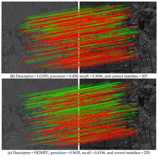 Figure 19 and Figure 20, Table 7 illustrate the average precision and recall results, as well as F1-measure and AUCPR results obtained with the six pairs of multi-sensor images from the SAT dataset. Compared with the results obtained with the CVC dataset and UAV datasets, it can be seen that the average precision and recall curves for the SAT dataset are much better, as are the F1-measure curves and AUCPR values. This is because the spectral ranges of the SAT dataset are much closer than the visible and thermal infrared images of the CVC dataset and UAV dataset. The greater the spectral range, the greater the difference between two local feature regions and, hence, the less efficient the usual descriptors become. However, the proposed HOMPC descriptor performs much better than the other descriptors, and LGHD, SIFT, NG-SIFT and MFD perform better than the remaining descriptors. The results of SURF, PIIFD, EOH and PCEHD are similar, and they are much better than the results of the LSS descriptor. Figure 21 shows the correctly matched points (green lines) and falsely matched points (red lines) of two typical descriptors (SURF and LGHD) and the proposed HOMPC descriptor of the sample image pair (Figure 8e) when the NNDR threshold = 1. The correctly matched points, precision, and recall values are also listed. It is shown that our proposed HOMPC descriptor is suitable for the feature description of multi-temporal, multi-sensor image pairs.