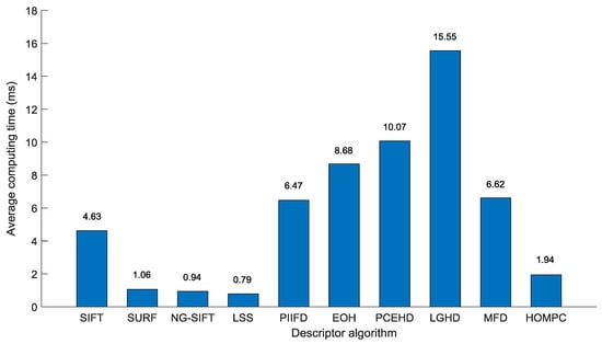 Based on the experimental results obtained using a PC with an Intel Core i3 CPU @ 2.5 GHz and 8 GB RAM, the average computation times of the descriptors for each feature point of all three datasets are shown in Figure 22. The LGHD descriptor is associated with a high computation time. This is because the LGHD descriptor use the multi-scale and multi-oriented magnitudes of the log-Gabor filters to calculate the feature vectors of all the scales. The MFD and EOH are much faster than LGHD because they use fewer scales and filters. The PIIFD and SIFT use trilinear interpolation in the algorithm and it is, therefore, much slower than SURF, which uses Haar wavelets and integral images for image convolution to obtain a fast feature descriptor. Instead of trilinear interpolation before constructing descriptors, the NG-SIFT uses a uniform feature weighting scheme, and LSS uses the maximum self-similarity values contributes the histograms of LSS. Similarly, the proposed HOMPC uses the values of convolved PCMs and MBMs to directly contribute to the bins of each cell. In this way, it much faster to construct the HOMPC descriptor. The calculations of PCMs and MBMs based on log-Gabor filters made it slightly slower than SURF, NG-SIFT, and LSS. However, the average precision and recall results, as well as the F1-measure and AUCPR results of SURF, NG-SIFT, and LSS for the datasets performed poorly. The average computation time of the proposed HOMPC descriptor is far lower than that of the other log-Gabor-based descriptors (LGHD and MFD).