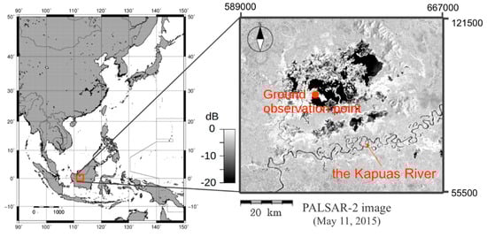 Lake Sentarum and its surrounding area are centered at 0°48′ N and 112°09′ E, stretch 78 km (east–west) and 66 km (north–south), and were selected as the study area (Figure 2). The area corresponds to x = 589,000 to 667,000 and y = 55,500 to 121,500 in the UTM49N projection, which is the original projection of the PALSAR-2 images. The rainy season lasts from October to June and the dry season lasts from July to September, with annual fluctuations []. To obtain ground references, a water gauge sensor (CO-U20-001-03, Onset Computer Corporation, Bourne, Massachusetts, MA, USA) and a time-lapse camera (GardenWatchCam, Brinno Inc., Walnut, CA, USA) were installed at the site in March 2017. Considering the AMSR2 availability (since 3 July 2012) and comparability with the ground references (only for a part of 2017), the target period from 3 July 2012 (the beginning of the dry season) to 30 October 2017 (the beginning of the rainy season) was set.