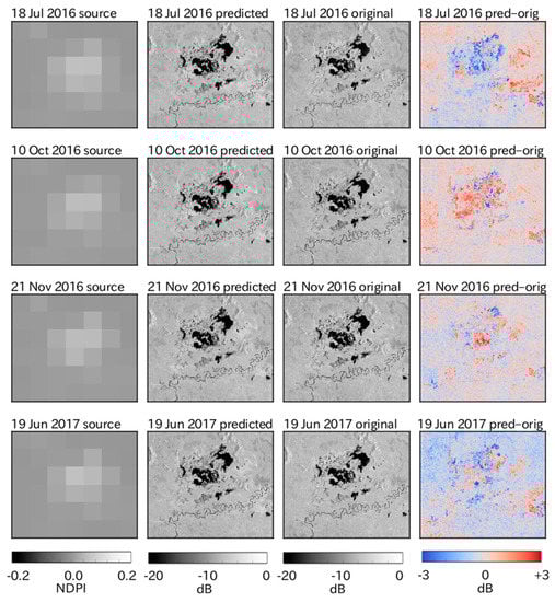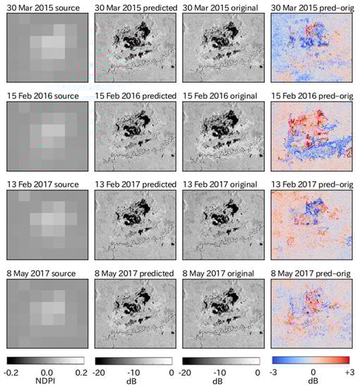 Image validation: good cases. The day, month and year are indicated in the title of each figure. ‘Source’ is the AMSR-2 NDPI composite image, ‘predicted’ is a prediction result of RFDBUX with the leave-one-out condition, ‘original’ is the PALSAR-2 HH σ0 image on that day, and ‘pred−orig’ is the ‘predicted’ minus the “original”.