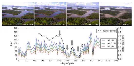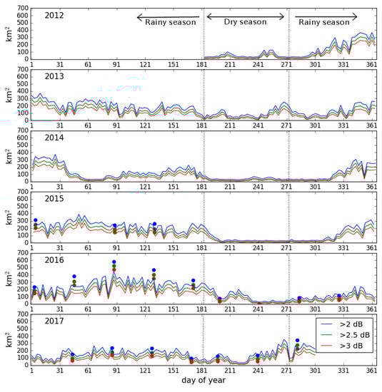 The RFDBUX approach was used to predict the spatial images for the entire study period (3 July 2012 to 30 October 2017) and the extent of seasonal water was roughly estimated by setting three thresholds, 2 dB, 2.5 dB, and 3 dB. Then, the area in which the spatial image obtained near the peak of the dry season (29 August 2016) minus the predicted spatial image was larger than each threshold was delineated. The water gauge and time-lapse camera data were obtained from March to August 2017, and were compared with the time series of the extent of seasonal water. The absolute pressure measured by the water gauge sensor to the water level was converted by assuming a hydrostatic condition in conjunction with the daily average surface air pressure from the ERA-Interim data [].
