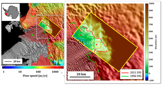 Grounding lines of Thwaites Glacier in 1996 (green) and 2011 (red) estimated using the DDInSAR method with European remote sensing (ERS) satellites [13,15]. The orange dotted rectangle in the eastern shelf indicates a larger ice rumple previously discussed by Tinto and Bell [7]. A newly-generated digital elevation model derived from TanDEM-X data on 10 June 2011 is shown within the yellow rectangle. The small red feature inside the yellow dotted square indicates the smaller ice rumple considered in this study. The background image is the MODIS Mosaic of Antarctica (MOA) image map [16]. The overlaid ice velocity map was extracted from Rignot et al. [17].