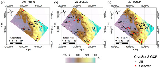 Generated high-resolution surface topography maps of the Thwaites ice shelf on (a) 10 June 2011; (b) 29 June 2012; and (c) 24 June 2013. Dark grey areas denote the locations of all the available CryoSat-2 SARIn altimeter elevation data, and red circles denote selected data.