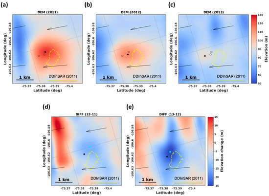 Detailed surface digital elevation models (DEMs) of the ice rumple from 2011–2013, showing its yearly surface deformation and surface velocity (arrows): (a–c) Location of maximum elevation in each of the three years (filled circles indicate the peak in that year); (d,e) Deformation maps for the periods 2011–2012 and 2012–2013 (later year subtracted from earlier year) where cyan circles indicate maximum surface depression and black circles indicate maximum elevation in each reference period. The InSAR grounding line in 2011 is plotted by the yellow dotted line [13,15].