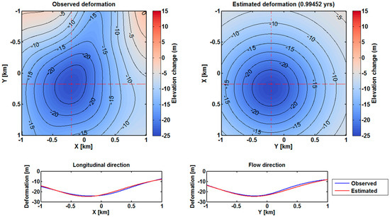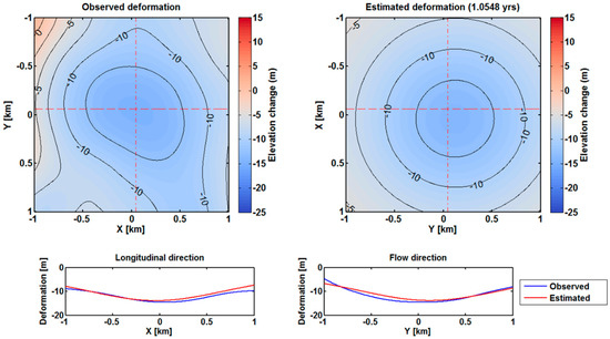 Comparison between the observed and estimated deformation from the modified deformation model after the global optimization process during 2011–2012, with the setting time as the actual elapsed time. The minimum root-mean-square (RMS) difference between the two deformation maps was 1.20 m. Profiles in the longitudinal and along-flow directions are plotted along the red dashed and dot-dashed lines, respectively.