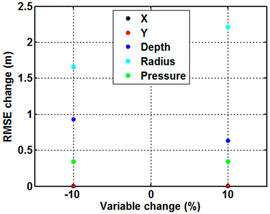 In order to analyze the dominant factor in the optimization result, we conducted simulations of the deformation model by varying the estimated parameters around a nominal value (Figure 9). The simulation outputs were induced by varying one parameter at a time while keeping all others fixed. The nominal reference values were chosen as the result of the optimization (Table 1), and the variations were made within 10% from the nominal values. The greatest variation in the result, i.e., the difference between the observed and estimated deformations, came from changing the radius of the spherical source (maximum variations of 1.88 and 2.51 m) from the original RMS difference—the smallest change was observed when varying the location of its center.