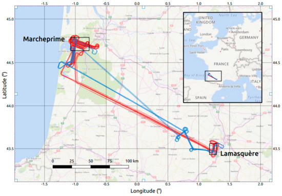 The study sites were located in the southwest of France (Figure 1). This region is characterized by a temperate climate, with annual rainfall ranging from 600 mm to 900 mm and a mean maximum daily air temperature close to 19 °C in summer. Two agricultural sites, Lamasquère and Marcheprime, were considered. The reference fields were sampled among various crops (wheat, sunflower, corn, soybean, carrots, green bean) presenting a wide range of cover characteristics during the two weeks of the airborne campaign.