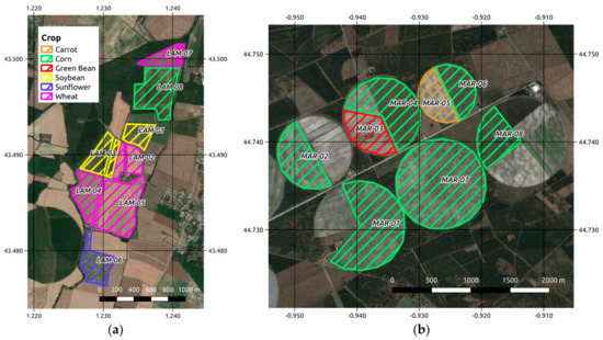 - The Lamasquère site (43.49°N, 1.23°E, Figure 2a) included eight fields (four wheat, two soybean, one corn and one sunflower)