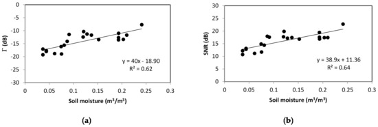 Figure 3 and Figure 4 show , the reflected SNR and PR as a function of soil moisture, for the two LAI classes. Each plotted point represents a GNSS-R mean measurement on a reference field at a given date. The number of samples is different from that of the reference fields; it varies from one measurement configuration to another. The sensitivity of GNSS-R observables to soil moisture can be seen to generally decrease with increasing LAI. The vegetation component, which attenuates the signal scattered by the soil, thus influenced the GNSS-R signal sensitivity to variations in soil moisture. As an example, for the 70–90° elevation interval, the sensitivity to soil moisture (S) decreased from 45.7 dB/(m3/m3) for the weak LAI values (LAI < 1) to 28.4 dB/(m3/m3) for the highest LAI values (LAI > 1). The same behavior was observed for reflected signal SNR, with the decreasing of sensitivity from 39 to 24.1 dB/(m3/m3), from weak LAI values to high LAI values, for the same elevation angle interval (70–90°). The dynamic range of the GNSS-R signals was greater than 10 dB for reflectivity and SNR. For the case of and reflected signal SNR, the retrieved sensitivity was greater than that in the case of the Leimon and GRASS campaigns, which reported values of ~20 dB/(m3/m3) [25,26]. They were in agreement with values retrieved in [19] using TechDemosat data (38 dB/(m3/m3)).