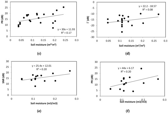 For the case of PR, we observed a low correlation with soil moisture (R2 < 0.2, even for low LAI values). This correlation suggests that, in airborne scenarios, the polarimetric ratio has a lower sensitivity to soil moisture, contrary to the findings reported for the example in [26]. This difference could be explained by the fact that the GLORI measurements were corrected for cross-polarization effects, thus removing most of the residual LHCP signal contributions from the RHCP reflected antenna. This limitation could be due to the high noise level in the PR data, coming from low values of . For this reason, it seems difficult to consider this observable in the analysis of soil moisture effect.