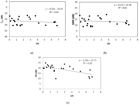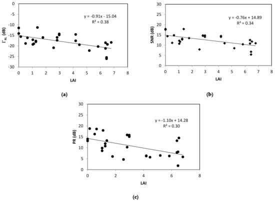 GNSS-R observables at 50–70° elevation angles as a function of LAI at dry conditions (wet moisture values (Mv) < 0.1 m3/m3): (a) ; (b) SNR; (c) PR.