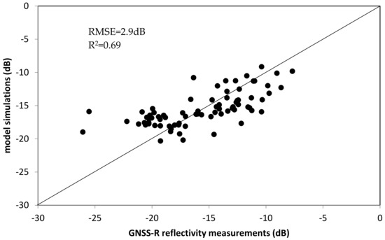 The calibrated parameters α, β, and δ can then be introduced into Equation (9), together with the known values of soil moisture, vegetation LAI and elevation angle, to determine the expected GNSS-R reflectivity.