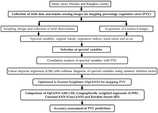 This study aimed to overcome this gap for the use of kNN by proposing a novel method that can be used to explore the spatial variability of k values and find a solution for the determination of an optimal k value at each location and then validating this method for mapping PVC of two arid and semi-arid areas, Duolun County of Inner Mongolia and Kangbao County of Hebei Province, China, using Landsat 8 images and field measurements from sample plots. This approach was compared with a global linear stepwise regression (LSR), GWR, traditional kNN with a constant k value (Cons_kNN) and RF. In this study, we demonstrated and validated the proposed method and its comparisons with the approaches in both Duolun and Kangbao County.