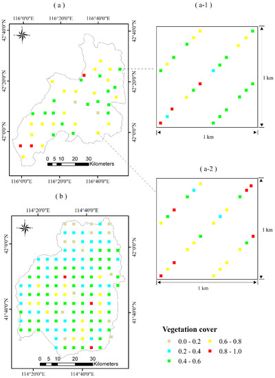 Land degradation and desertification is a serious ecological and environmental problems and has received worldwide attention [1,2,3]. Percentage vegetation cover (PVC) represented with the range of values from 0.0 to 1.0 in this study is one of the effective indicators for assessing land degradation and desertification in arid and semi-arid areas and has been widely used. However, collecting field measurements of PVC in remote and sparsely populated arid and semi-arid areas is labor-intensive and time-consuming [4]. This method works for small areas only, which cannot provide the detailed information of spatial characteristics and temporal trend of PVC at a regional or global scale. Compared with the traditional method, remote sensing technologies can repeatedly offer images that cover a same region and quantify the spatial variability and temporal dynamics of PVC. Moreover, mapping PVC using remotely sensed images also requires collection of in situ data on sample plots to develop and validate prediction models, which implies a combination of ground measurements from sample plots with remote sensing data to map PVC.