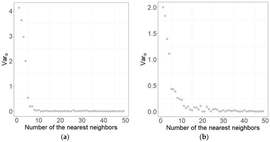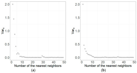 Variance change rates () against k (the number of nearest plots used) for two randomly selected locations (pixels (a) and (b)) to be estimated in Kangbao County.