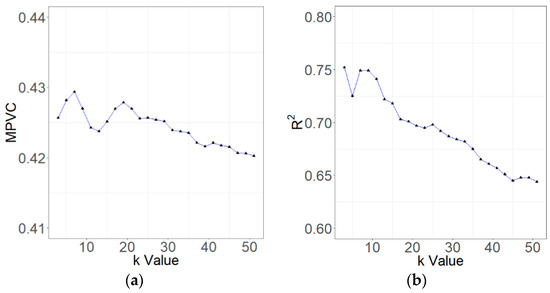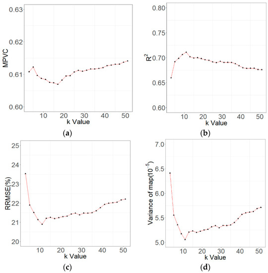 The Con_kNN method with different k values led to the mean predictions of PVC that fell in the confidence interval of the test data for Duolun County and the confidence interval of all the sample plot data for Kangbao County at the significant level of 0.05, although the mean predictions fluctuated (Figure 7a and Figure 8a). For Duolun County, moreover, as the globally constant k value increased, the coefficient of determination R2 increased at the beginning, reached its maximum value when k = 11 and then decreased (Figure 7b). With the increased k values, RRMSE and decreased at the beginning, reached their minimum values when k = 11, and then increased (Figure 7c,d). This indicated that the k = 11 was globally optimal for Duolun. For Kangbao County, R2 had the maximum value when k = 3 and then continuously decreased with the increased k value, except there was an increase of R2 value when the k value increased from 5 to 7 (Figure 8b). With the increased k values, RRMSE and continuously increased. This implied that the globally optimal k value for Kangbao was 3 (Figure 8c,d).