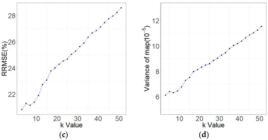 The accuracy assessment results of PVC predictions for Kangbao County using Cons_kNN with 25 different k and leave-one-out cross validation based on the whole dataset: (a) mean prediction of plot percentage vegetation cover (MPVC) (confidence interval: 0.40–0.46); (b) coefficient of determination, R2; (c) relative root mean square error (RRMSE); and (d) variance of the predicted PVC values for the maps ().