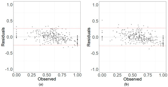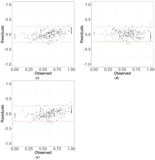 The residuals of percentage vegetation cover predictions graphed against the observations or referenced values for Duolun County using: (a) Linear stepwise regression (LSR); (b) Geographically weighted regression (GWR); (c) Constant kNN (Cons_kNN) with 11 nearest plots; (d) Optimized kNN (Opt_kNN); and (e) Random forest (RF). The red dashed lines represented the confidence interval of zone residuals at the significant level of 0.05.