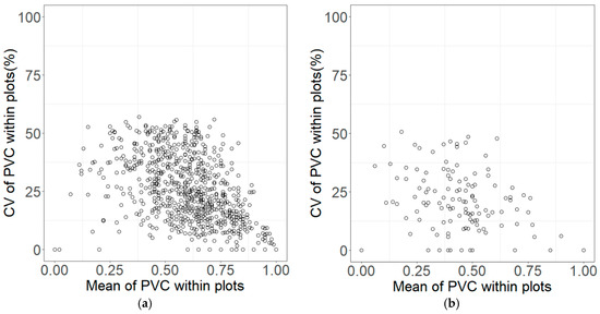 The coefficient of variation (CV) of the PVC observations from five 1 m × 1m subplots within each of the plots graphed against their mean for (a) Duolun and (b) Kangbao County.