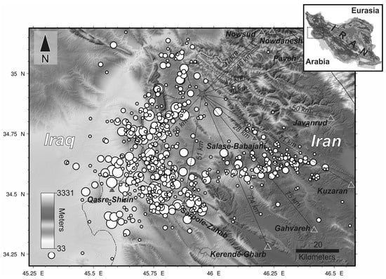 Iran is located in a seismically active region between two tectonic plates to the north (Eurasia) and the south (Arabia). In recent decades, Iran has experienced several deadly earthquakes that caused considerable casualties, which makes a rapid observation system necessary to increase disaster response and improve emergency management in the aftermath of an earthquake. Recent major earthquakes in different parts of Iran include the 2003 Bam earthquake (M 6.3) in central Iran, which caused approximately 40,000 causalities, the twin earthquakes in Ahar-Varzaghan in NW Iran (M 6.4 and 6.4) in 2012, which caused more than 300 casualties, and the 2013 Makran earthquake (M 7.3) in the SE subduction zone [,,]. More recently, at 21:48 Iran Standard Time on 12 November 2017, a magnitude 7.3 earthquake occurred in the Zagros seismotectonic zone in western Iran at a depth of 18 km and particularly affected Kermanshah Province [,]. This event was the deadliest earthquake in 2017; it caused more than 600 casualties, injured 7000 people and left 15,000 people homeless, and it was not only felt in the neighboring provinces of Iran but was also recorded by seismological stations in neighboring countries, such as Iraq, Turkey and Azerbaijan []. According to the Iranian seismic network, the earthquake occurred in Iranian territory in Kermanshah Province, near the Iraqi border. The event was called the Kermanshah or Sarpole-Zahab earthquake in Iran; in Iraq, it was called the Halabja earthquake. In the early hours after the earthquake, no structural damage was reported in towns located north of the epicenter (e.g., Paveh and Nowsud). In contrast, the main damage reported by visual inspections conducted by experts and local residents was located in towns south of the epicenter, such as Salase-Babajani, Sarpole-Zahab and Qasre-Shirin [,]. As shown in Figure 1, the epicenter was located 28, 51 and 56 km from Salase-Babajani, Sarpole-Zahab and Qasre-Shirin, respectively. The highest peak ground acceleration (PGA) record of the Iranian Strong Motion Network, which is operated by the Building and Housing Research Center (BHRC), was at the Sarpole-Zahab station, where the longitudinal (L), traverse (T) and vertical (V) components were 681 cm/s2, 562 cm/s2 and 404 cm/s2, respectively. The event’s PGA records at the Nowsud station, which is located 37 km NW of the epicenter, were 48 cm/s2, 45 cm/s2 and 44 cm/s2 for the L, T and V components, respectively, which indicates that the seismic waves propagated from north to south []. Because the Sarpole-Zahab station is located in a forward direction, its high PGA record is reasonable and implies that the shorter distance between the site and the epicenter cannot exclusively reflect the nature of damage to buildings. If we assume that the quality and construction methods of the structures in the towns north and south of the epicenter are similar, the geological/topographical conditions and shear wave velocity of the upper 30 m (Vs30) are the most important factors that affected the heavy damage in the towns south of the epicenter. A shaded relief map of the study area indicates that Sarpole-Zahab and Qasre-Shirin are located in relatively flat regions, whereas the majority of the towns to the north of the epicenter, such as Paveh, are located in topographically rugged regions, which may reduce the impacts of local seismic amplification (Figure 1). The average Vs30 values for Nowsud and Sarpole-Zahab are approximately 760 m/s and 290 m/s, respectively. These Vs30 values were extracted from Iran’s national Vs30 map, which was developed from topographic and geological data as a proxy for seismic amplification and indicates that sites with lower Vs30 values have greater potential of being damaged during earthquakes [].