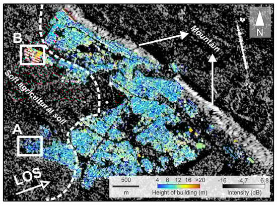Heights of buildings with an accuracy of 0.5 m overlaid on the Sentinel-1 intensity image of Sarpole-Zahab acquired from an ascending orbit. The dashed line indicates the boundary of soft soil. Boxes A and B are the samples of new and old buildings, respectively, shown in Figure 4.