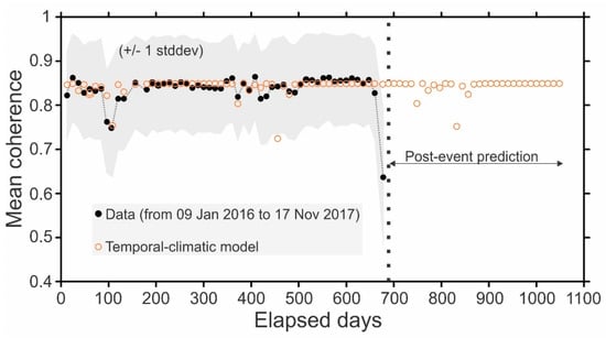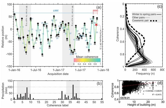 where is the modeled coherence of the sequential method, is precipitation, is the time differential between image and image which is 12 days (or more) for Sentinel-1A products, and are coefficients estimated from least squares and iteration methods. We impose a constraint on the nonlinear part of the TC model such that should be nonzero. This constraint does not change the outcomes significantly, but it forces the TC model to produce logical coherence values that are not greater than one []. Thus, the TC model is useful for separating the seasonal effects from the earthquake effects. Figure 5 shows that the TC model fits the calculated results well, and the overall RMSE is 0.02. The RMSE in the winter-to-spring period of 2016 (i.e., days 0–156) was 0.007, whereas the RMSE in the winter-to-spring period of 2017 (i.e., days 348–492) was 0.03. The TC model in the summer to autumn of 2016 (i.e., days 157–336) tends to overestimate the mean coherence values, whereas during the 2017 summer-to-autumn period (i.e., days 494–660), the TC model underestimates the mean coherence value until the sequential coherence chain is broken by the earthquake between days 660 and 678. Table 1 shows the summary of the statistical parameters, the estimated coefficients and the sensitivity of the TC model.