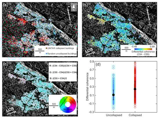 Damage in Sarpole-Zahab from optical and radar imagery. (a) Locations of 683 collapsed buildings (red circles) extracted by UNITAR from pre-event WorldView 3 satellite (30 m resolution) and post-event optical data from the Pleiades satellite (50 m resolution). The blue circles are 683 randomly selected uncollapsed buildings; (b) Damage map from the SSSC method; (c) RGB color composition map; (d) Differential coherence () values of two damage levels deduced from the SSSC method.