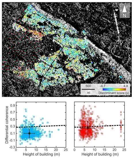 The mean coherence over the town with an area approximately 7 km2 decreases by up to 0.1 of the coherence (~10% of the coherence) due to the rooftop deformations of old buildings after heavy precipitation events. Washaya et al. also showed that a coherence loss of approximately 38% occurred immediately before the earthquake []. Using LSSC, the physical condition of each individual building, especially old and weak buildings, can be monitored if they are influenced by long-term stationary changes such as heavy rain. Additionally, the mean coherence decay caused by the earthquake was 0.24, which implies that stationary and nonstationary events can be easily distinguished with continuous urban monitoring using this method. The TC model is used to estimate the sensitivity of the mean coherence during the spring-to-winter and summer-to-autumn periods and to predict the mean coherence values in the absence of an earthquake. The model fits the data well, but it is not guaranteed to be reliable if the temporal parameter in Equation (6) is large. Accordingly, the impacts of different temporal baselines must be quantified in future studies. Because the relationship between the building height and the coherence is not sufficiently strong, the overall accuracy of the outputs of the logistic discriminant analysis is low. In addition, the number of misclassified buildings in the collapsed category was higher than that of the uncollapsed category. This was probably caused by two reasons: (1) because of the coarse resolution of the Sentinel-1 dataset, the pixel size is larger than the size of the buildings, so most buildings near collapsed buildings cannot be distinguished; and (2) for large buildings that cover more than one coherence pixel, we used only the pixel value that covers the centroid of the buildings, which increases the uncertainty of the building classification. Different pixel averaging methodologies or different window sizes may reduce the number of misclassified buildings and increase the overall accuracy.