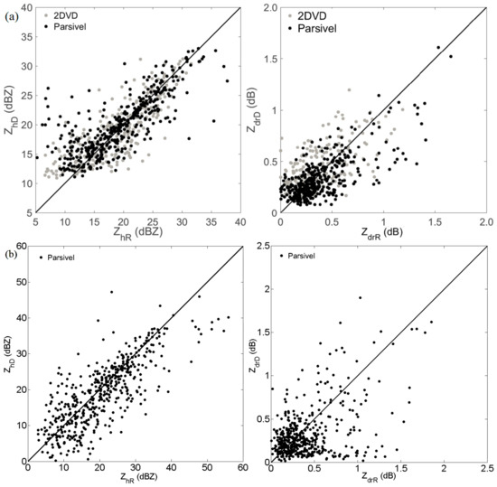 The scatter plots between the calibrated radar reflectivity ZhR and differential reflectivity ZdrR at the position of the disdrometers (0.5° elevation angle of the radar antenna) and the corresponding reflectivities (ZhD and ZdrD) estimated from the disdrometers for (a) 2012 and (b) 2014 observations.