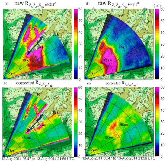 The same as Figure 5 but for the rain event of 12 August 2014, before (a,b) and after the VPR correction (c,d) at elevations 2.5° (a,c) and 3.5° (b,d).