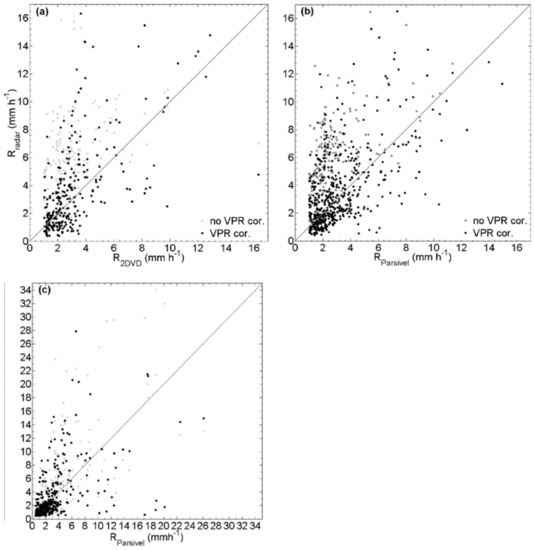 The scatter plots of rainfall rate, estimated from the radar (at the 1.5° elevation) without (light grey dots) and with VPR (black dots) correction against in situ measurements for the rain events of (a,b) 2012 and (c) 2014.
