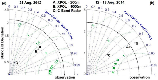 Note that the means of the fields are subtracted out before computing their second-order statistics so the diagram does not provide information about overall biases, but solely characterizes the centered pattern error. The position of each letter appearing on the plot quantifies how closely the radar precipitation estimates match the reference. The cRMSD between the observed and the reference patterns is proportional to the distance to the point on the x-axis identified as the reference “observation”. For both events, we note a low correlation for the operational C-band estimates and a significant underestimation of the reference standard deviation. For instance, for the 25th of August (Figure 10a) event the correlation coefficient of the XPOL estimates (both 200 and 1000 m resolution) are nearly 0.75 compare to the C-band estimates that have 0.35 (Figure 10a). The normalized RMSD (nRMSD) is also lower for the XPOL estimates. For the stratiform precipitation event of 12–13 August 2014 (Figure 10b), the XPOL estimates reveal higher correlations (~0.85) and lower RMSD values (close to 1.5). The C-band estimates also exhibit higher correlation (close to 0.7) and relative RMSD close to 1.8. The XPOL precipitation fields had standard deviations close to the reference rainfall fields, while the C-band precipitation estimates greatly underestimate the reference rainfall variability.
