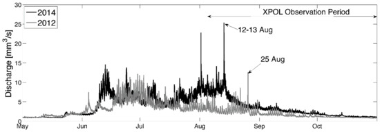 Based on the air temperatures of the Matsch LTER network, both events happened during a warm summer period. The snow limit was quite high (between 4500 and 3100 for the first one, between 3400 and 3100 for the second one), and therefore could be assumed that most of the basin was contributing by having liquid precipitation. On the basis of previous studies on the catchment, which analyzed the water sourced distribution along the season [70] and for specific events [51] we can estimate that in August roughly 50% of the base flow is due to glacier-melt, the snowmelt is negligible and the peak runoff is due to liquid precipitation.