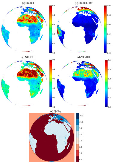 Broadband MTAL-R albedo for January 15, 2012: (a) Total short-wave bi-hemispherical (SW-BH); (b) total short-wave bi-hemispherical error (SW-BH-ERR); (c) near infrared directional-hemispherical (NIR-DH); (d) visible directional-hemispherical (VIS-DH); and (e) quality flag.
