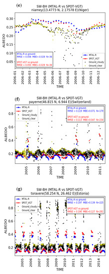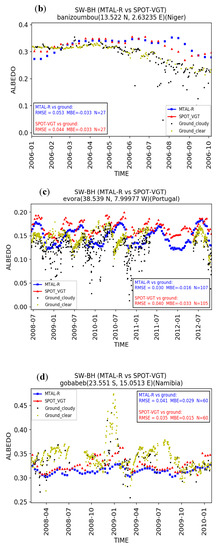 On the one hand, in Section 4.1 a set of ground albedo stations are considered from various networks including Agoufou, Banizoumbou, Evora, Gobabeb, Niamey, Payerne, and Toravere. The data collected by these European and African stations are used to qualitative assess the MTAL-R product. For the sake of comparison, surface albedo data derived from the SPOT-VGT satellite are also included. The strategy to calculate comparable albedo values for MTAL-R and SPOT-VGT is discussed in Section 3.3.3.