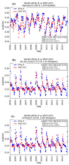 The Copernicus Global Land Service provides a land surface albedo product from SPOT-VGT satellite data. The retrieval method that is used for the version 1 of this product was designed in the framework of the FP5/CYCLOPES project [46]. This albedo product has a production period of around 10 days and a synthesis period of 30 days. The dates associated to the frequency of production depends on the age of the last observation used during the composite period. More details can be found in the product user manual for the surface albedo product from SPOT-VGT (http://land.copernicus.eu/global/products/sa; GIOGL1_PUM_SAV1, issue I1.10—last time consulted on 22 May 2018). The surface albedo products are delivered in 10 by 10 degrees tiles of around 1 km × 1 km resolution. The SPOT-VGT surface albedo product for the period between January 2004 and May 2014. All the data were used for our evaluation exercise. Only SW-BH surface albedo was considered for the validation procedure to agree with the MTAL-R product. We refer to this product as SPOT-VGT in the rest of the document.